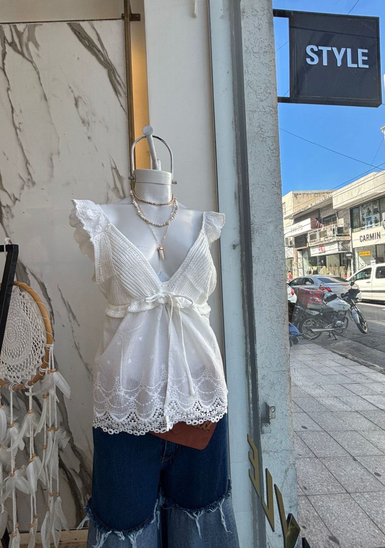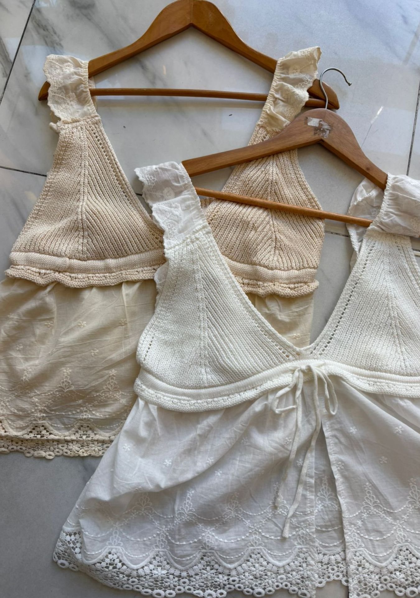 Musculosa combinada tejido con broderie, talles S/M y L/XL