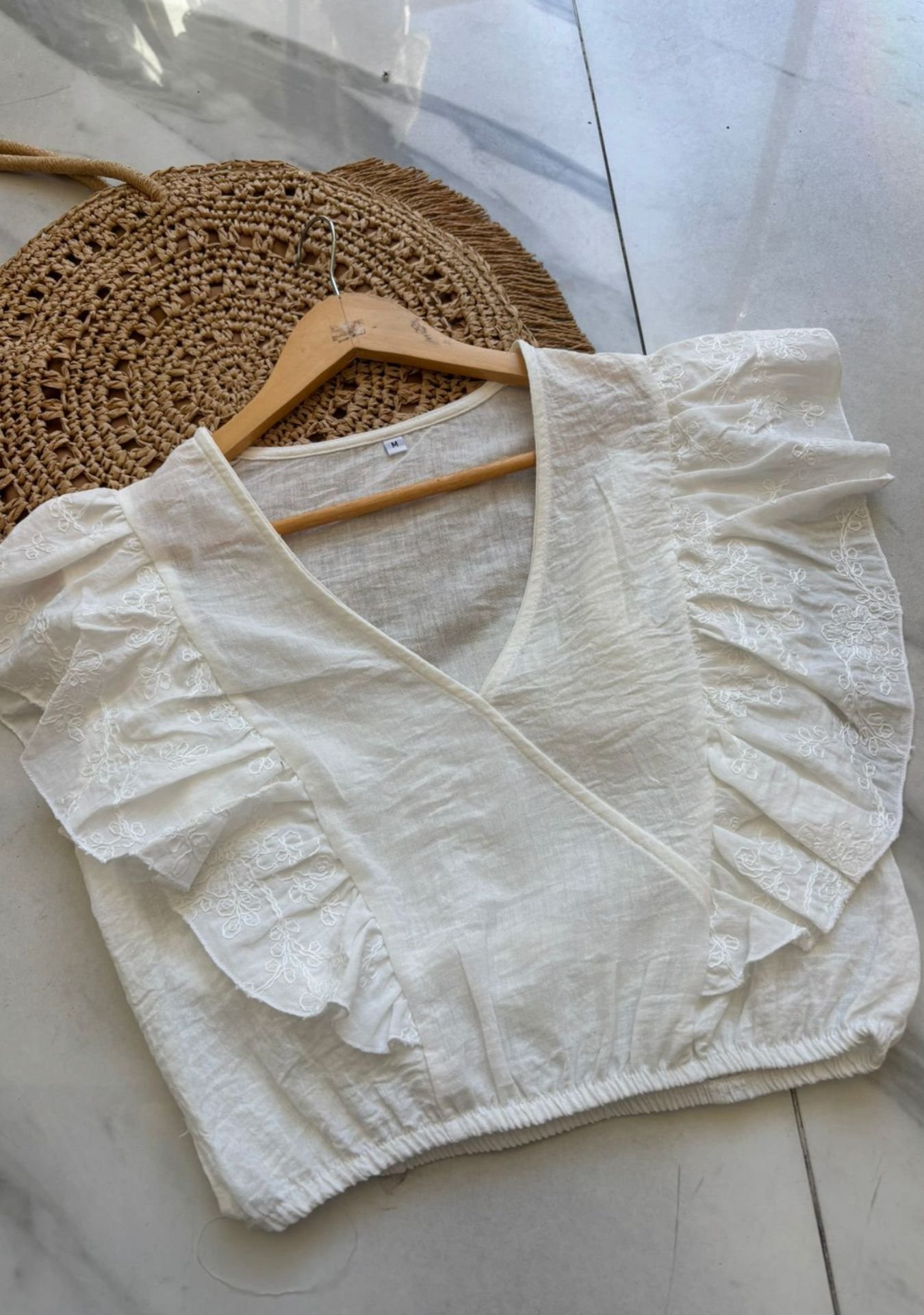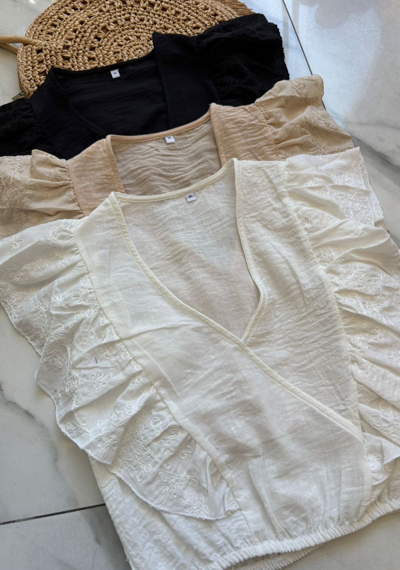 Blusa de polinen liso y bordado, con elástico y volados, talles M y XL